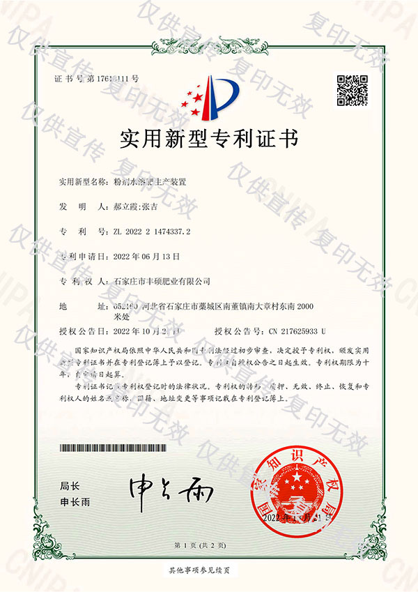粉劑水溶肥生產(chǎn)裝置專利證書(shū)