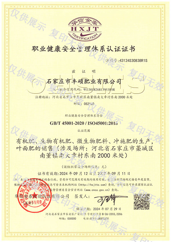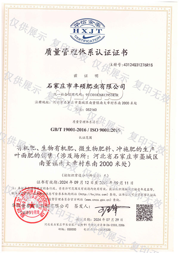石家莊市豐碩肥業(yè)有限公司是一家集新型肥料的研發(fā)、制造、營(yíng)銷、服務(wù)于一體的高新技術(shù)企業(yè),公司自2008年創(chuàng)辦以來(lái),一直致力于新型肥料的技術(shù)研發(fā)和市場(chǎng)推廣。公司組建了豐碩新型肥料研究中心(院士專家企業(yè)工作站),自主知識(shí)產(chǎn)權(quán)研發(fā)團(tuán)隊(duì)專業(yè)科研人員20余人,獲得了多項(xiàng)肥料國(guó)家發(fā)明專利。公司目前已擁有發(fā)酵類有機(jī)肥、微生物菌劑、生物有機(jī)肥、土壤調(diào)理劑、大量元素水溶肥、含腐植酸肥料、含氨基酸肥料、中微量元素肥料等8大品類,“金維克”、“豐碩沃農(nóng)”等2大自有品牌,擁有20多個(gè)暢銷品種。目前,我公司已經(jīng)通過(guò)了“ISO9001 質(zhì)量管理體系認(rèn)證”、“ISO14001 環(huán)境管理體系認(rèn)證”、“OHSAS18001 職業(yè)健康管理體系認(rèn)證”。...